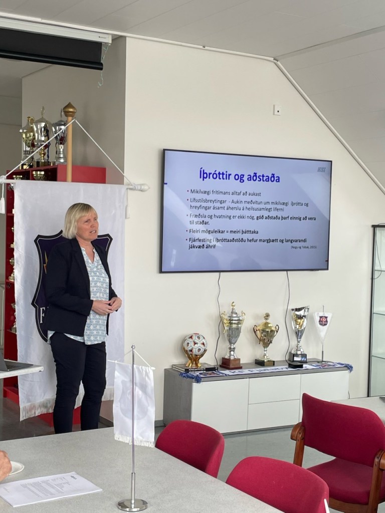 Fundur: Fundarstjóri bauð alla fundargesti velkomna með kaffi og léttum veitingum. Vanda Sigurgeirsdóttir, Formaður KSÍ fékk orðið og hóf fyrirlestur um framtíð fótboltans í Fjallabyggð, aðstöðuleysi til knattspyrnu iðkunar í Fjallabyggð og hvaða áhrif það getur haft í framtíðinni fyrir okkar börn. Í dag þurfa flest allir flokkar KF að sækja æfingar fyrir utan bæjarfélagið 8 til 9 mánuði á ári til þess að æfa við samkeppnishæfa aðstöðu. Í dag er Fjallabyggð eina bæjarfélagið sem nemur yfir 1500 íbúa sem ekki er komin með gervigrasvöll. Vanda rannsóknir sem hafa verið gerðar við iðkun kvennaknattspyrnu sem sýnir fram á það að stelpur eiga frekar til að falla úr íþróttum fyrr ef ekki er hægt að æfa í heimabyggð. Vanda sagðist velta fyrir sér að þegar hún horfir í kringum Fjallabyggð þá spretta upp gervigrasvellir og þá spyr hún, afhverju ekki Fjallabyggð? Ætlum við að verða síðust í að reyna halda uppi grasvelli á norður hjari veraldar þar sem vetur yfirgnæfir árið. Með gervigrasvelli gefur það okkur ekki 12 mánuði í æfingar en fjölgar töluvert. Í dag getur KF boðið iðkendum sínum uppá 3 til 4 mánuði við æfingar á okkar æfingasvæði en með komu gervigrasvallar verða mánuðirnir allt að 9 sem hægt væri að æfa við topp topp aðstæður. Vanda svaraði spurningum gesta og lauk svo sínu erindi.