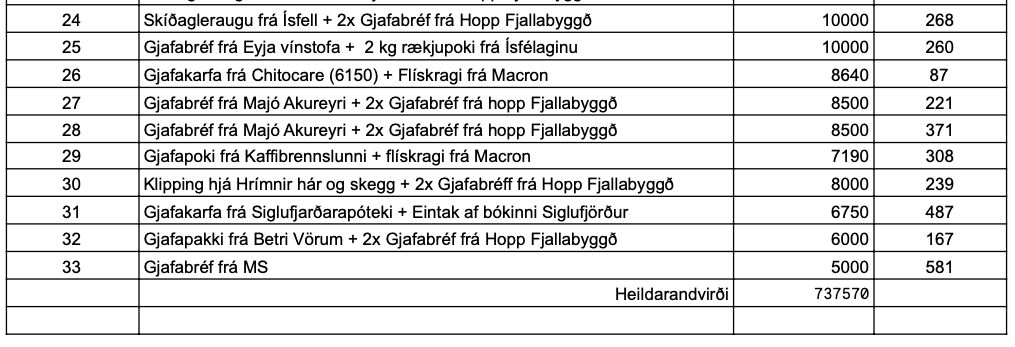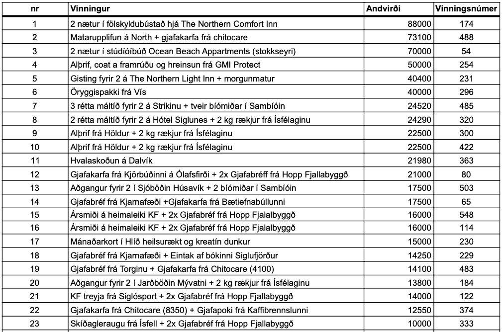 Jólahappdrætti KF Vinningsskrá Posted on 16/12/2024 by meistaraflokkur Færðu inn athugasemd Fyrr í dag var dregið út í jólahappdrætti KF hjá sýslumanni og hér fyrir neðan má sjá vinningsnúmerin Deila: Click to share on X(Opnast í nýjum glugga) X Click to share on Facebook(Opnast í nýjum glugga) Facebook Líka við Hleð... Tengt efni Knattspyrnufélag Fjallabyggðar