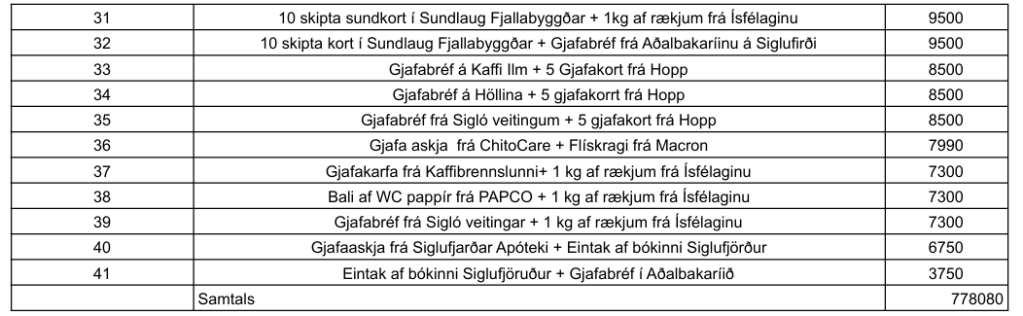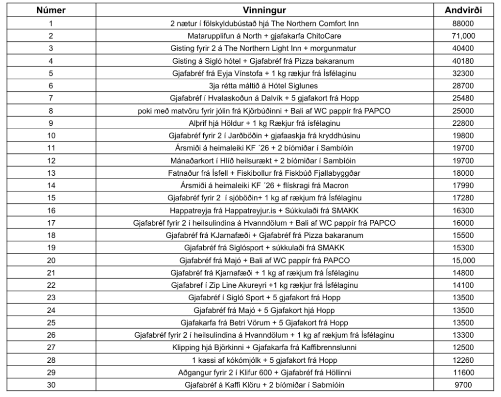 Jólahappdrætti KF Posted on 16/12/2025 by meistaraflokkur Færðu inn athugasemd Árlega jólahappdrætti KF er nú í fullum gangi og verður dregið út núna á föstudaginn 19. desember. Vinningarnir eru hver öðrum glæsilegri eins og sjá má á vinningaskránni hér að neðan. Hvetjum alla til þess að næla sér í miða Deila: Click to share on X(Opnast í nýjum glugga) X Click to share on Facebook(Opnast í nýjum glugga) Facebook Líka við Hleð... Tengt efni Knattspyrnufélag Fjallabyggðar